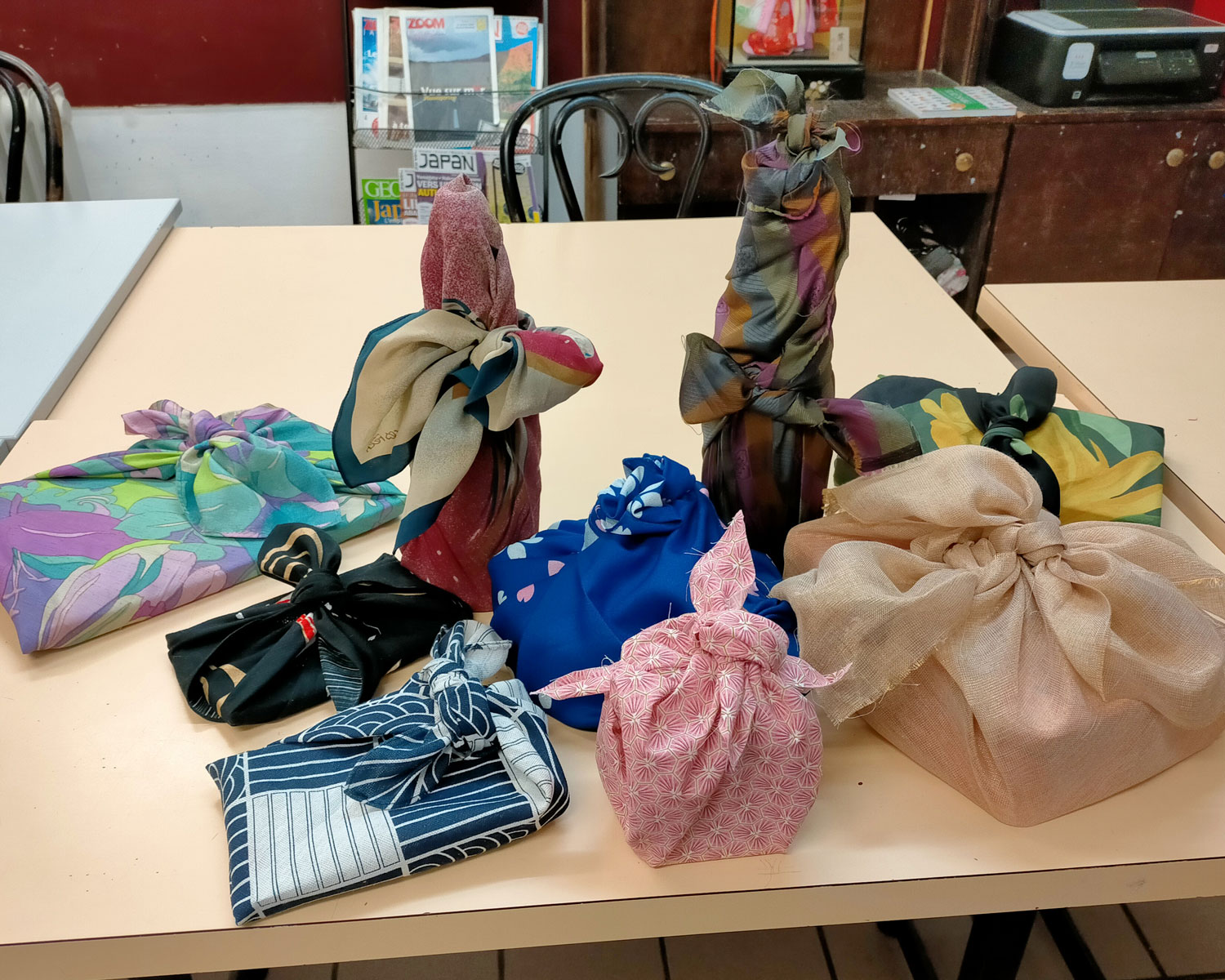 Je vous montre des techniques adaptées aux différentes formes de cadeaux ou objets. Les tissus sont prêtés pour s’exercer mais vous êtes invité à apporter les vôtres ainsi que des objets de différents formats (livres, boîtes rondes, rectangulaires, bouteille etc....). Il vaut mieux des formes de tissu carré assez grand.