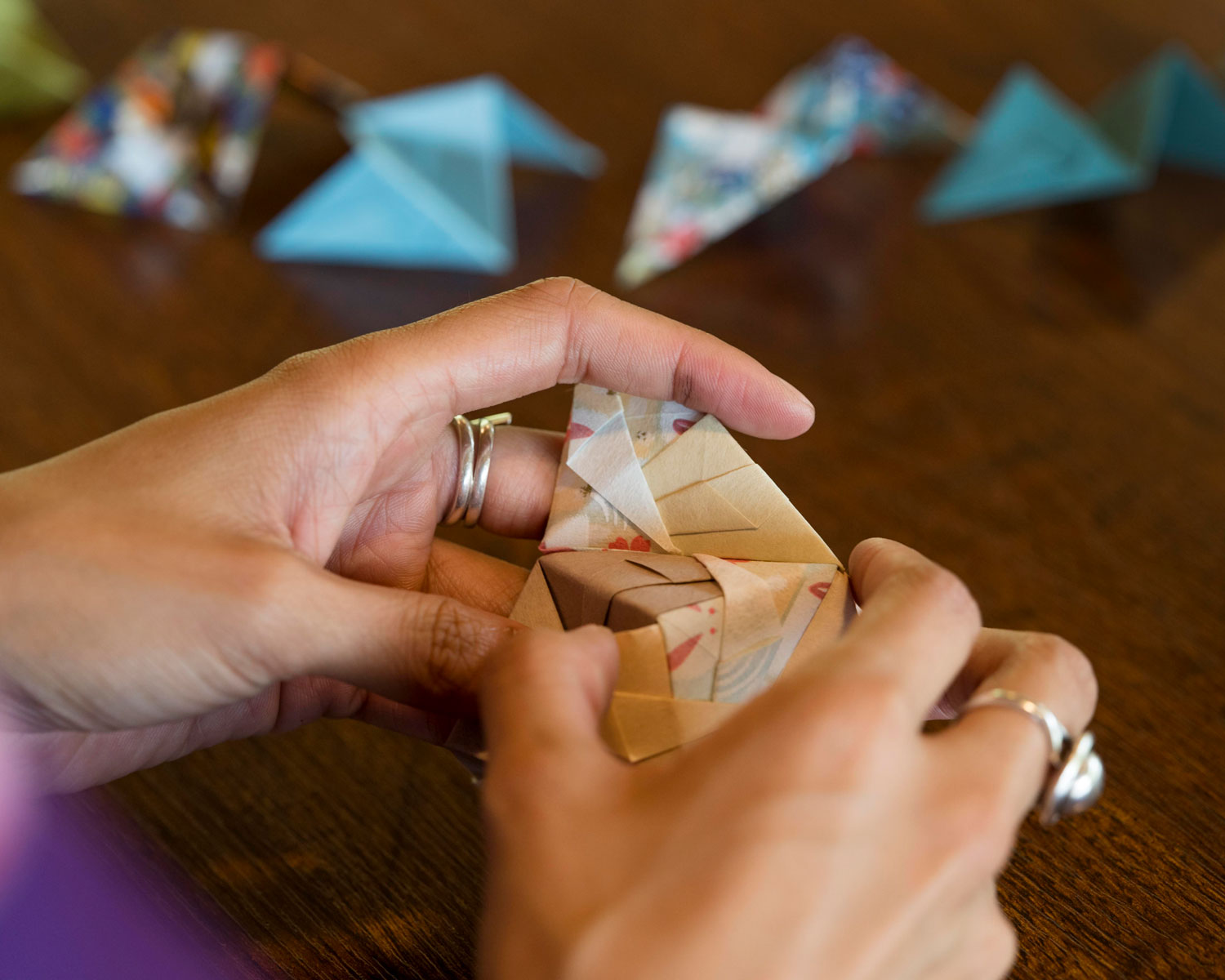 Un atelier consiste à s’entraîner aux différentes formes de pliage en réalisant d’abord des origami simples.