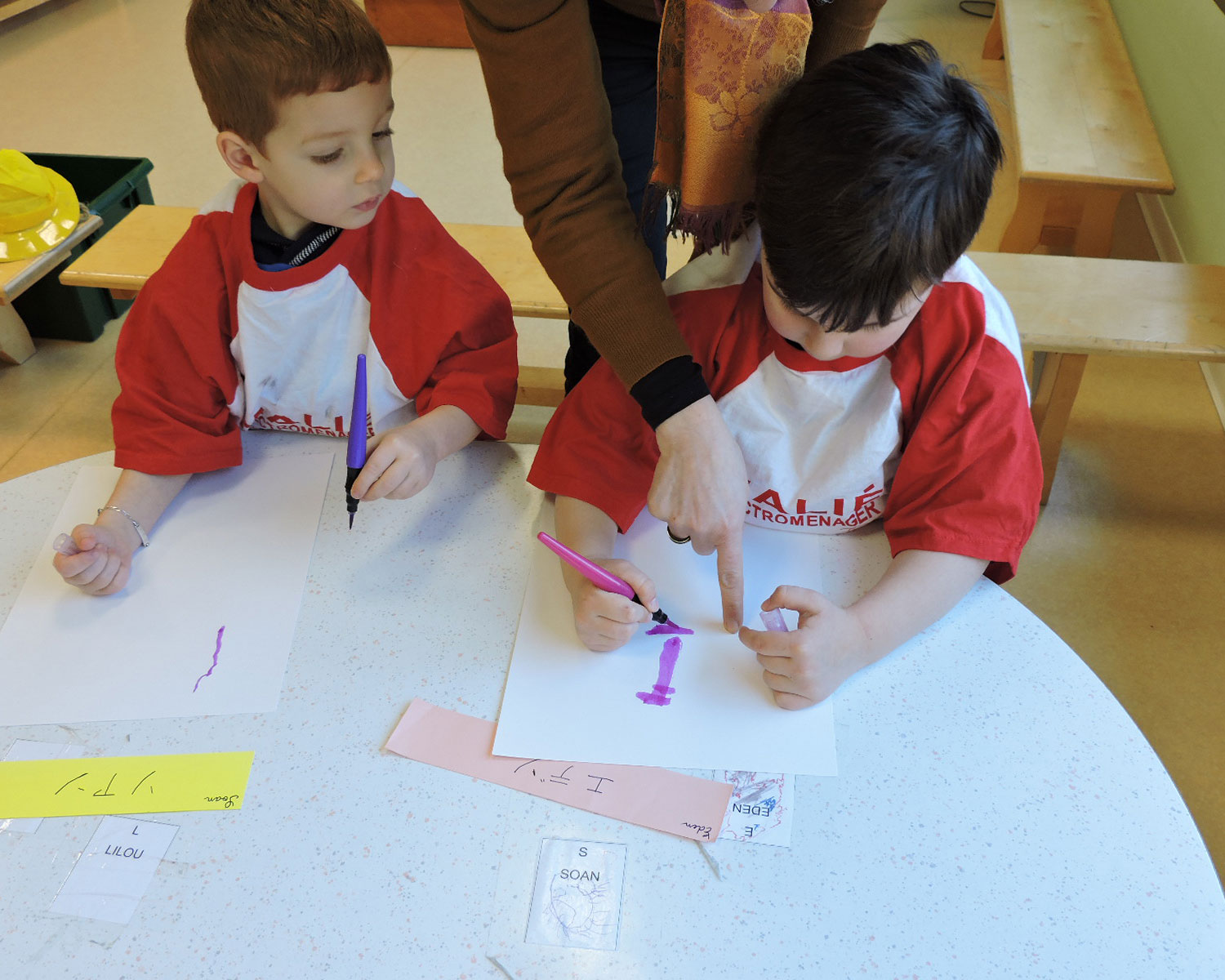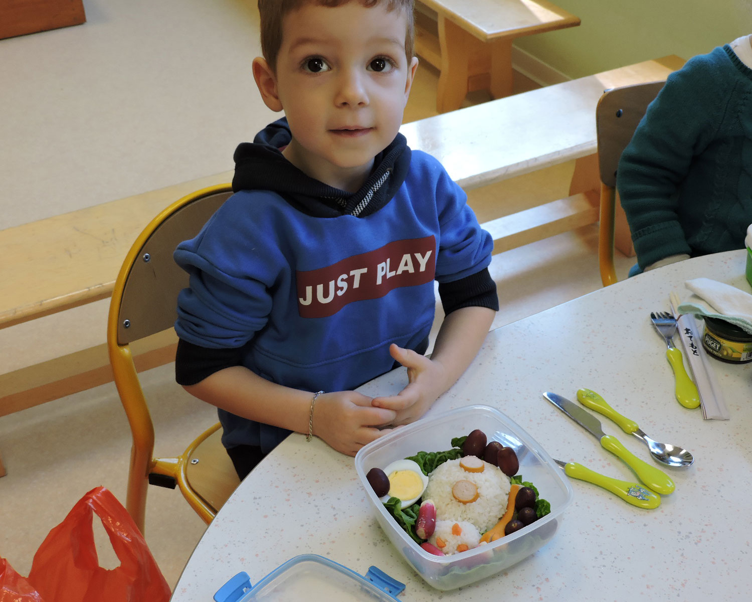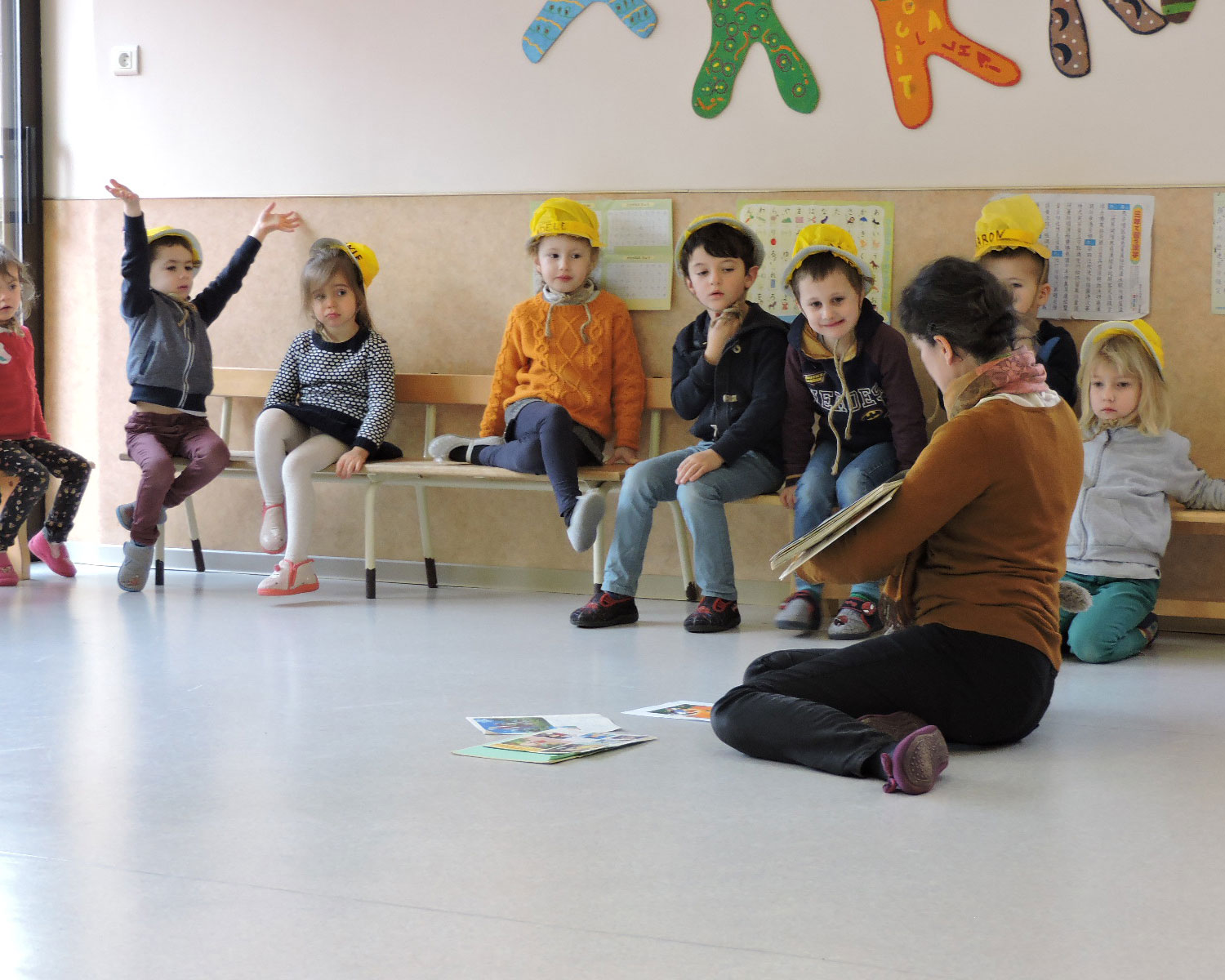 Il s’agissait d’une matinée et d’un déjeuner à la japonaise. Les enfants avaient confectionné des chapeaux jaunes comme les écoliers japonais. Je leur ai montré et raconté l’histoire de « mon voisin Totoro » (sensibilisation à un système d’écriture différent), ils ont écrit leur nom en japonais et nous avons mangé ensemble dans la salle de classe des bento préparés par les parents.