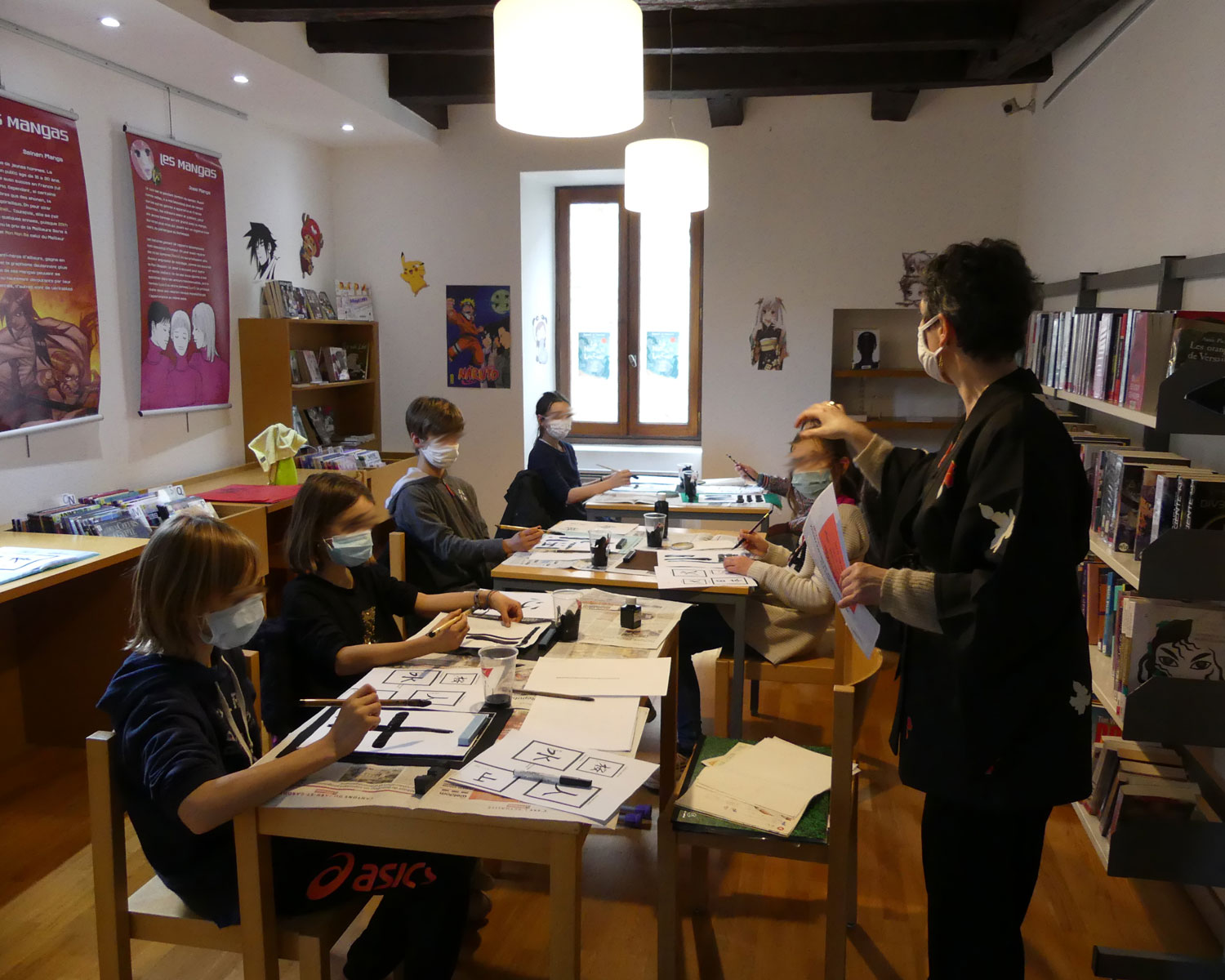 Animation d’atelier manuel pour jeunes enfants (réalisation de carpes en papier ou de marque page kimono.) et calligraphie pour les plus grands.